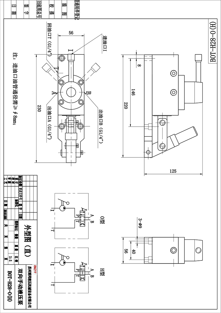 本雙向手動液壓泵采用內排內泄結構。換向集成與泵體一體,通過換向手柄轉動,可分別選擇出油A口或B口方向出油打壓,通過進油口(回油口)吸油和回油,進出油接口分別是G1/4;